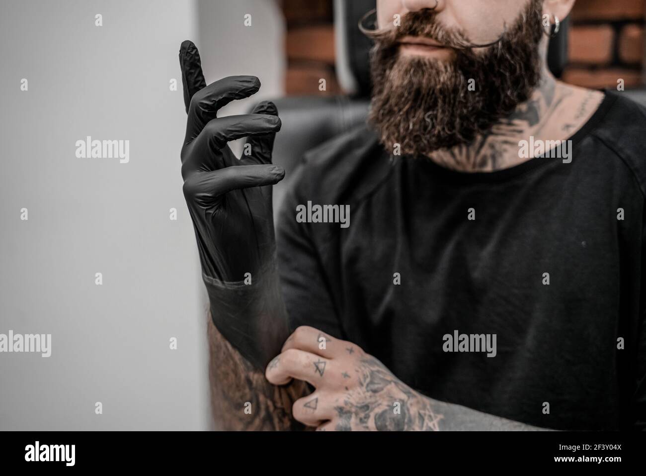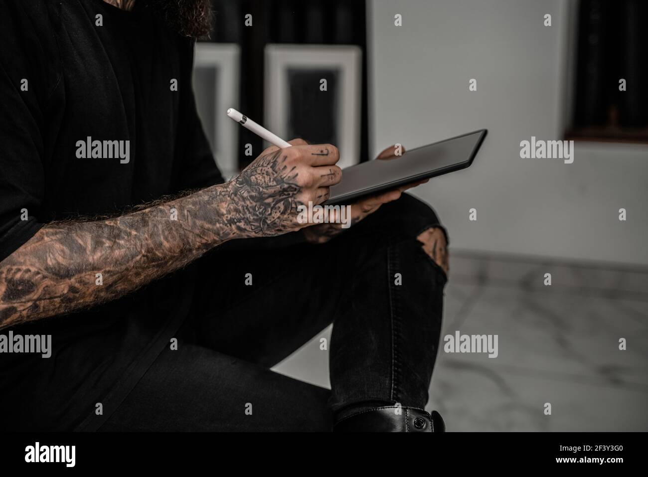 Close Up Young Man Tattoo Artist Drawing Pencil And Sketch Standing In Workshop Place Concept Photo Of Tattoo Salon Stock Photo Alamy